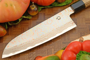 Blade: Yu-shoku san mai blade with a V-Toku2 carbon steel core surrounded by mokume forged from stainless steel, copper and brass (Hrc 62 - 63)