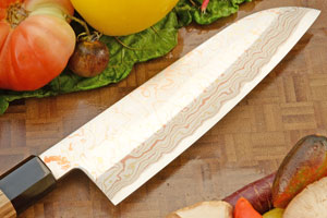 Layers of alternating stainless steel, brass and copper (mokume) surround a premium V-Toku2 carbon steel core. V-Toku2 is among the highest performing carbon steels -- combining strength and durability. The combination of the multi-colored stainless mokume and a convex grind (hamiguri-ba) assists food to release from the side of the knife. The steel is precision forged and tempered to Hrc 62-63 for a long lasting, keen edge. The blade is distal tapered for optimal balance and has an extremely thin, keen edge for the highest performance. Because the blade is forged from carbon steel, this knife must be dried after use to prevent rust and tarnish. We recommend using camellia oil for easier care. The ambidextrous blade features a 50/50 grind.