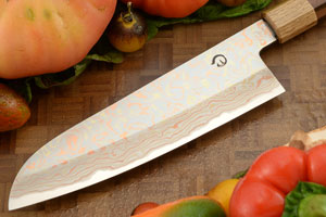 Blade: Yu-shoku san mai blade with a V-Toku2 carbon steel core surrounded by mokume forged from stainless steel, copper and brass (Hrc 62 - 63)