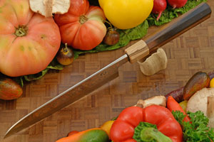 The ambidextrous handle combines macassar ebony with an oak ferrule. The traditional octagonal shape is very comfortable for extended use and is a shape preferred by professional chefs.