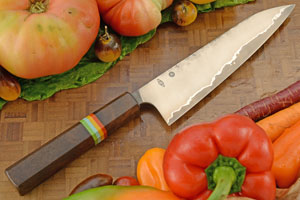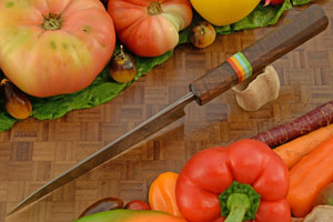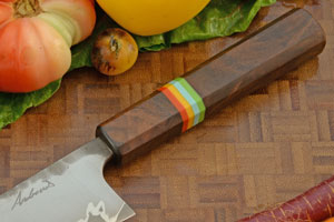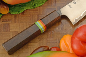 The Japanese inspired ambidextrous octagonal handle is walnut wood. Red, yellow, teal, and green G-10 spacers separate the handle from the bolster. The front of the handle is sealed with a black G-10 cap which helps prevent water from getting in. Like other knives, this knife should not be put in the dishwasher.