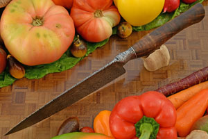 Description: Washington knifemaker, Andrea Lisch is both a bladesmith and a blacksmith. She has worked alongside her husband, Mastersmith David Lisch in both these roles for many years. Her skill in design and bladesmithing clearly shows through on this elegant chef's knife. This is as good as a chef's knife gets!