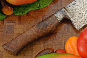 Andrea began forging this integral chef's knife beginning with 1080 and 15N20 carbon steels. The feather damascus pattern is immediately captivating and draws attention from a distance. By forging closely to shape, she ensures optimal grain structure for a keen, long lasting edge. The blade is beautifully thin with a nice distal taper for clean, perfect cuts. A convex grind assists food to release from the blade while slicing. By hardening the blade to 59-61 Hrc, Andrea ensures a keen, long lasting edge.
