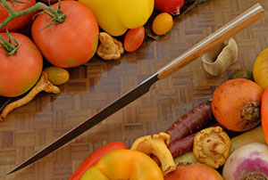 A utility knife is between a chef’s knife and a paring knife, with a narrower and straighter blade. This makes it perfect for a multitude of small tasks where more precise cuts are needed, such as trimming broccoli, green beans, or other smaller vegetables. Some cooks like to use it in their hand, too—almost like a large paring knife. Others like its smaller size as an alternative to the chef’s knife. Utility knives are sometimes called sandwich knives because they work well on almost everything that goes into a sandwich—from thin-skinned vegetables such as tomatoes, to meats and cheeses.