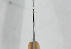 African wild olive wood handle scales are set on the full tang for strength and durability. This light toned wood has a beautiful swirling grain. This knife is extremely light and well balanced. Like other knives, it should not go in the dishwasher.