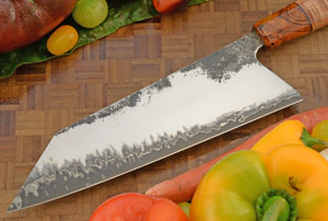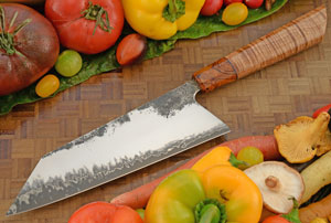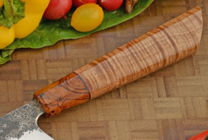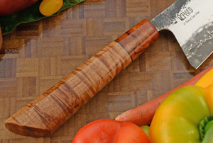 The ambidextrous Japanese-inspired handle is a style called a half-octagonal. The faceted top is matched with a rounded base for comfort. The handle is stabilized bigleaf maple. The wood has a dramatic tight curl. The Arizona desert ironwood (olneya tesota) bolster provides nice contrast. Thin G-10 spacers assist the handle to adjust to temperature and humidity changes. The handle is comfortable in both a pinch grip and a full handle grip. Like other knives, this knife should not go in the dishwasher.