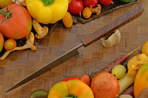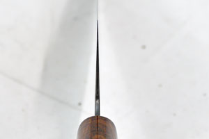 The ambidextrous Japanese-inspired handle is a style called a half-round. The faceted top is matched with a rounded base for comfort. The bolster and handle are exhibition grade Australian ringed gidgee (Acacia cambagei). Gidgee is a member of the acacia family (the same family as koa). It grows in arid regions of Australia, resulting in dense wood with a hardness similar to Arizona desert ironwood. The slow-growing gidgee may hang on for hundreds of years and produces one of Australia’s hardest and most durable timbers. A fiber spacer adds a subtle contrast. The handle is comfortable in both a pinch grip and a full handle grip. Like other knives, this knife should not go in the dishwasher.