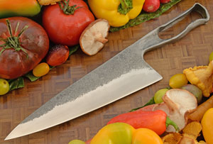 Description: This chef’s knife was hand forged by Rhode Island bladesmith Josh Prince. Josh’s work combines high functionality with artistry to create knives that are sure to become a family heirloom.