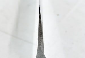The knife was forged to shape from a single piece of CPM-3V tool steel. At 7.5% chromium, CPM-3V is considered a carbon steel (since it must have >11% chromium to be considered stainless), yet it does have limited rust resistance and is easier to care for than many carbon steels. We recommend using camellia oil to avoid oxidation. Additionally, it combines outstanding toughness and superior edge retention. The resulting blade will have an extremely keen, long-lasting edge. A shinogi grind ensures effortless food release from the sides of the knife. The spine and choil are well-rounded to reduce hotspots when used in a pinch grip.