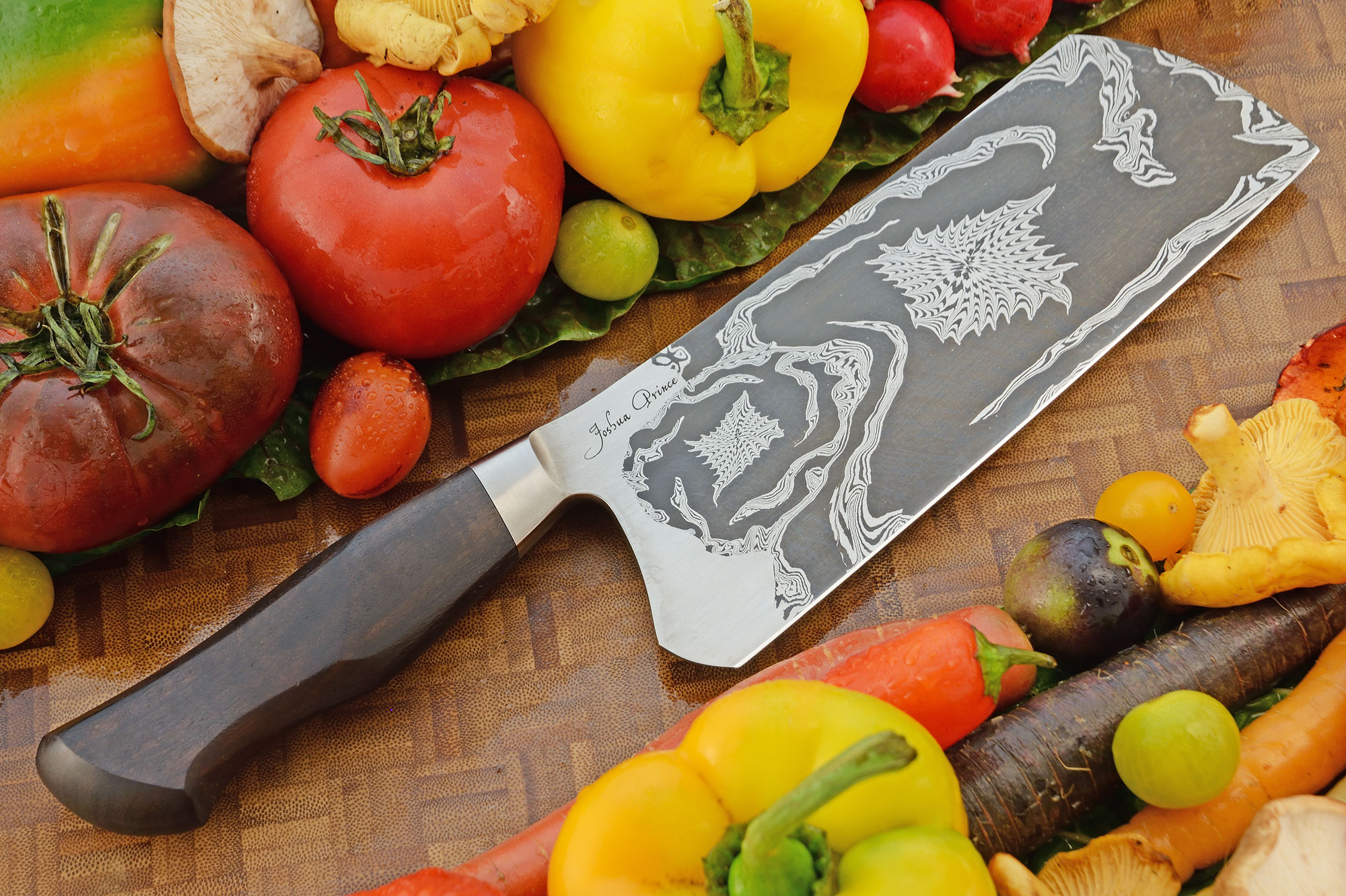 Description: This meat cleaver was hand forged by Rhode Island bladesmith Josh Prince. Josh’s work combines high functionality with artistry to create knives that are sure to become a family heirloom. Josh creates knives that carry a natural, organic flow in their shapes. He skillfully uses negative space in his damascus patterns to create visual depth and dynamic movement, enhancing both aesthetic appeal and functionality. While artistic, his knives are highly functional and designed to last a lifetime.