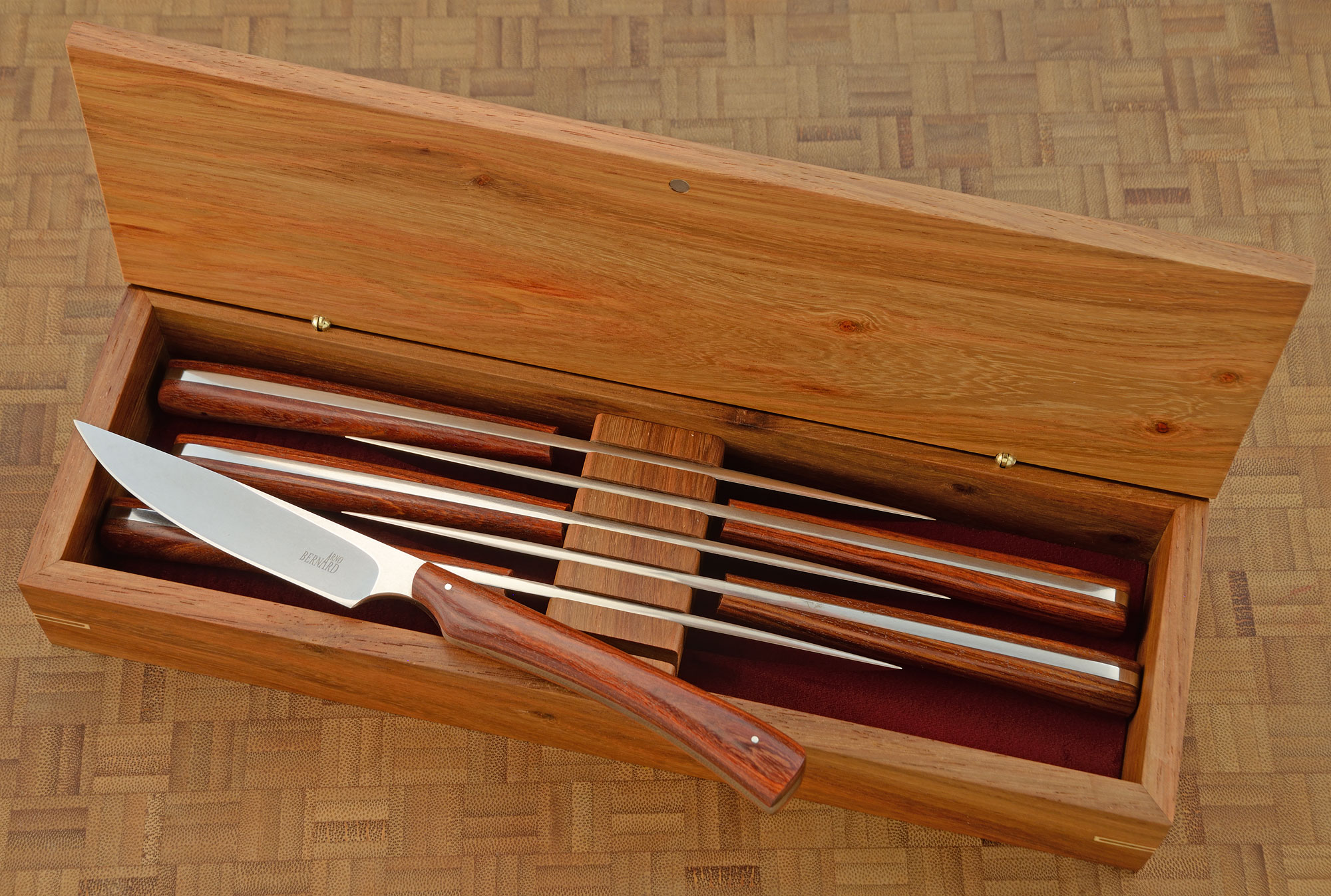 Description: This dramatic steak knife set was hand-built by South African knifemaker Arno Bernard. Arno Bernard Sr. is a maker from South Africa and has been making knives for over 35 years. He has been a member of the Knifemakers Guild of Southern Africa (KGSA) for over 20 years. Living in South Africa has allowed him the luxury of using many different exotic handle materials -- some even collected himself.