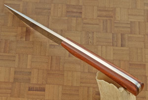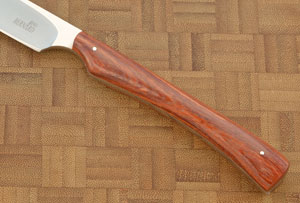 South African snake bean wood handle scales are set on the full tang for strength and durability. Snake bean wood has bold, interlocking stripes that create a dramatic, almost snake-skin pattern, making the handle stand out immediately. The handles are nicely rounded for a comfortable grip.