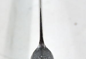 The 8.2 inch blade was hand forged, combining 1085 and 15N20 carbon steels. The intricate damascus pattern is exceptionally controlled and shows tremendous skill at the forge. By incorporating a thicker section of 15N20 toward the center of the blade, Porto created a pattern that draws attention from a distance and demands examination up close. The combination of steels ensures a keen, long lasting edge. The spine and choil are nicely rounded for comfort. William's touchmark is inlaid with fine silver on the left side of the blade.