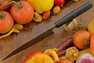The ambidextrous Japanese-inspired handle is ancient bog oak. This wood has been buried in a bog for hundreds or sometimes thousands of years. The extremely low oxygen conditions of the bog protect the wood from normal decay, while the underlying peat provides acidic conditions where iron salts and other minerals react with tannins in the wood, gradually giving it a distinct dark brown to almost black color. A carbon fiber frame seals the sides of the handle. This nimble knife is perfectly balanced: once you use it, you won't want to put it down.