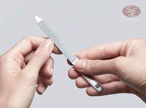 Nail files are used after clipping or cutting nails, or to touch-up rough edges. This sapphire nail file has a fine grit side and coarse grit side. The coarse side of the nail file shapes the nails, while the fine side smooths them. The tip of the file is gently pointed for cleaning underneath the nails. A matte stainless steel handle completes the file. The filing surfaces measure 2.75 inches long, with an overall length of 5 inches.
