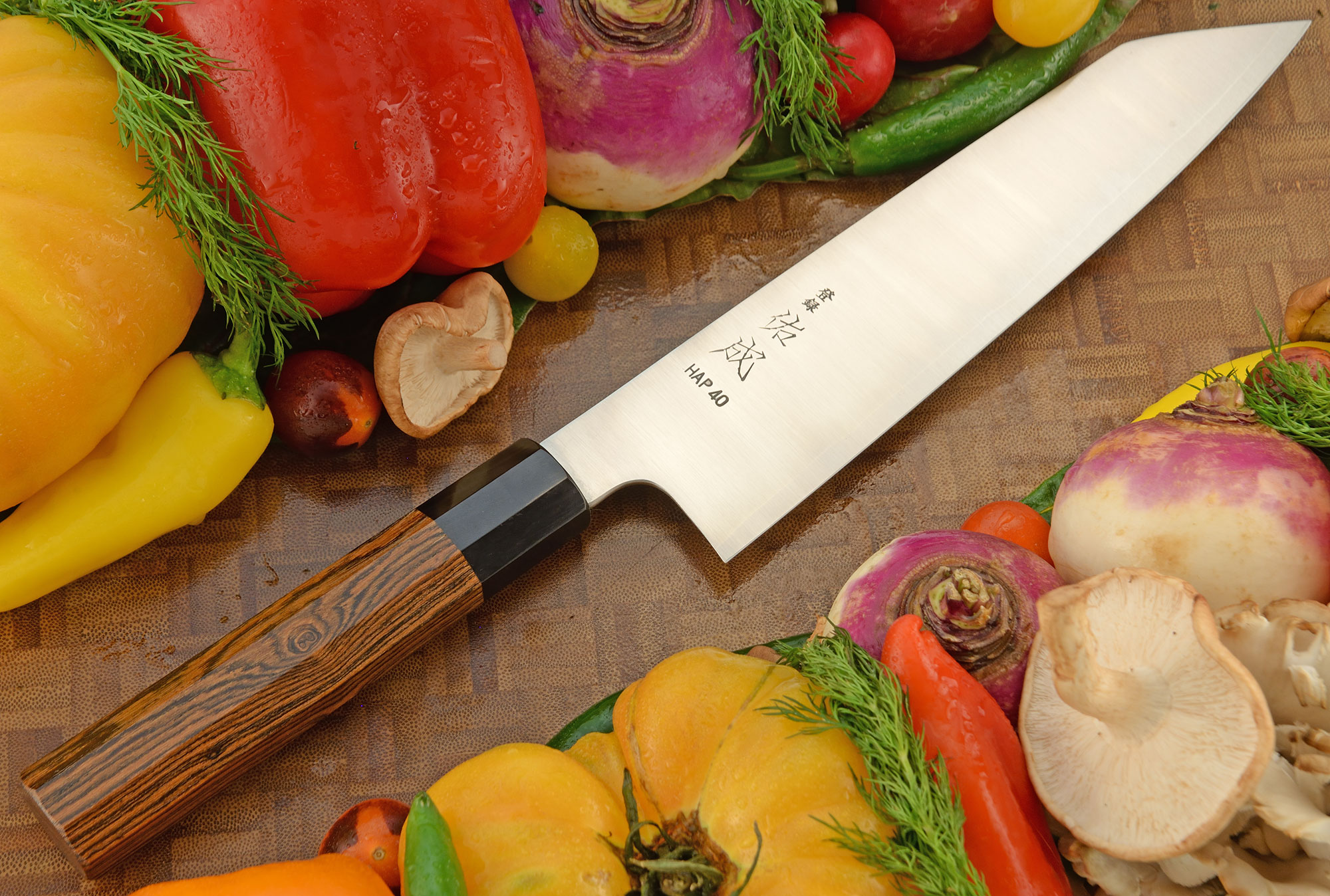 The Sukenari HAP40 series features hand ground blades clad with a satin finished stainless steel sides. The face of the blade is convex ground to reduce sticking and friction during cutting. The edge is an ambidextrous 50/50 grind. This light weight, perfectly balanced knife is sure to be a favorite in your kitchen.