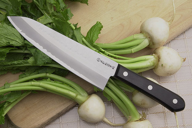 Description: The gyuto is modeled after the French pattern chef's knife. Longer and slimmer than the santoku, it is well suited to preparation of meat and other general purpose tasks around the kitchen. The long blade is needed for the sawing motion required to cut meat and the slim profile keeps the weight low and the balance right.