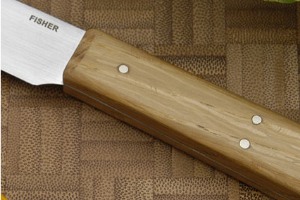 Description: Robert Fisher is currently apprenticed to Mastersmith PJ Tomes. Under the watchful eye of his master, he has created this exceptional handmade paring knife. The 420 stainless steel blades have keen, long-lasting edges and have been hand satin finished. The handles are formed from oak and are attached with four nickel silver pins. The natural wood holds up well to kitchen use. Excellent fit and finish throughout.