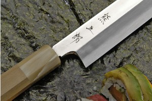 The yanagi is a traditional Japanese knife used to cut boneless fish fillets. It is mainly used for a drawing cut. The heel of the knife is placed on the fish and the knife is lightly pressed down, letting the weight of the knife do the work while drawing the blade toward you. Sashimi knives are also excellent for slicing other boneless meats.