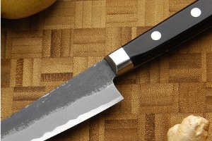 Our Ohishi Kurouchi knives are forged from aogami (blue steel #2), among the most prized of carbon steels. This steel has exceptional edge holding and takes a keen edge. The center core is surrounded by layers of low carbon steel. The surface is rough ground (kurouchi finish) so that food does not stick to the sides of the knife while slicing. Because the blades are forged from carbon steel, rather than stainless steel, they require minimal additional care to prevent corrosion and staining, but have a far keener edge than their stainless counterparts.