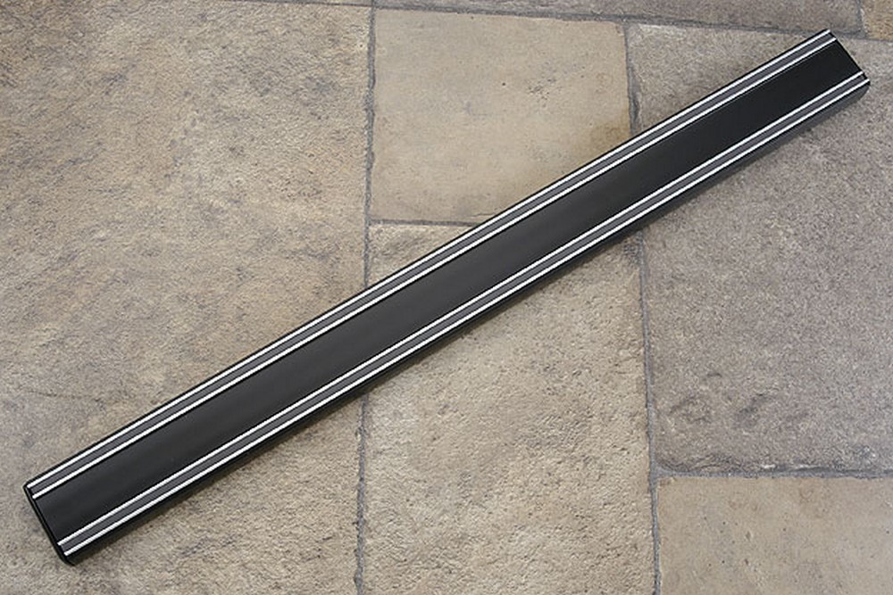 Description: This 20 inch long magnetic knife rack securely holds knives within easy reach without using valuable counter space. Wusthof combined two extra-strong magnet strips with black synthetic for a safe, easily visible and space-saving place to store knives. Easily attached to walls and cabinets using included screws.