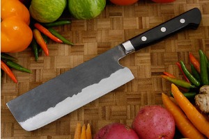 Description: The nakiri usuba is a traditional Japanese knife form ideal for chopping fruit and vegetables. The edge is double-beveled, like a Western knife. Though sometimes called a vegetable cleaver, the thin edge geometry makes it a precision tool, rather than a Japanese equivalent to a meat cleaver.
