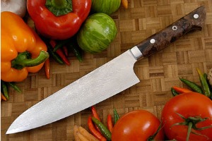 The gyuto is modeled after the French pattern chef's knife. Longer and slimmer than the santoku, it is well suited to slicing and chopping -- an ideal general purpose chef's knife. The long blade is needed for the sawing motion required to cut meats and fish and the slim profile keeps the weight low and the balance perfect.