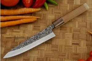 The two tone blade is produced by two different etching processes creating a dramatic high contrast between the Kiriba (blade bevel) and the flat of the blade. This creates a smooth surface for the blade to slide through material and a subtly uneven surface to help release foods being sliced. The blades are comprised of a hard inner SLD stainless steel core clad in stainless steel damascus (suminagashi). Because SLD is a relatively low chromium stainless steel, we recommend drying the knife after use. The mesmerizing suminagashi pattern flows freely on both sections further enhancing the unique styling of this line.