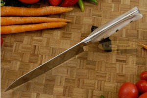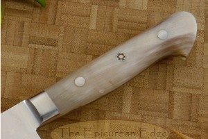 The handle was formed by bladesmith Daniel O'Malley from sheep horn. Not only does sheep horn have tremendous resiliency, but this dramatic material also has the unique quality of becoming grippy when it gets wet. With proper care, hard-wearing horn will hold up well in the demanding environment of either a commercial or home kitchen. A single piece of horn is cut so as to have the hair-like grain pattern travel across the tang. Mr. O'Malley has profiled the handle to be very comfortable and provide the chef with a secure grip. Two stainless steel hidden bolt rivets and an elegant stainless steel and copper mosaic pin secure the scales to the tang. The rivets have been profiled to match the horn - the seam is imperceptible. This is a knife both high-performing and elegant!