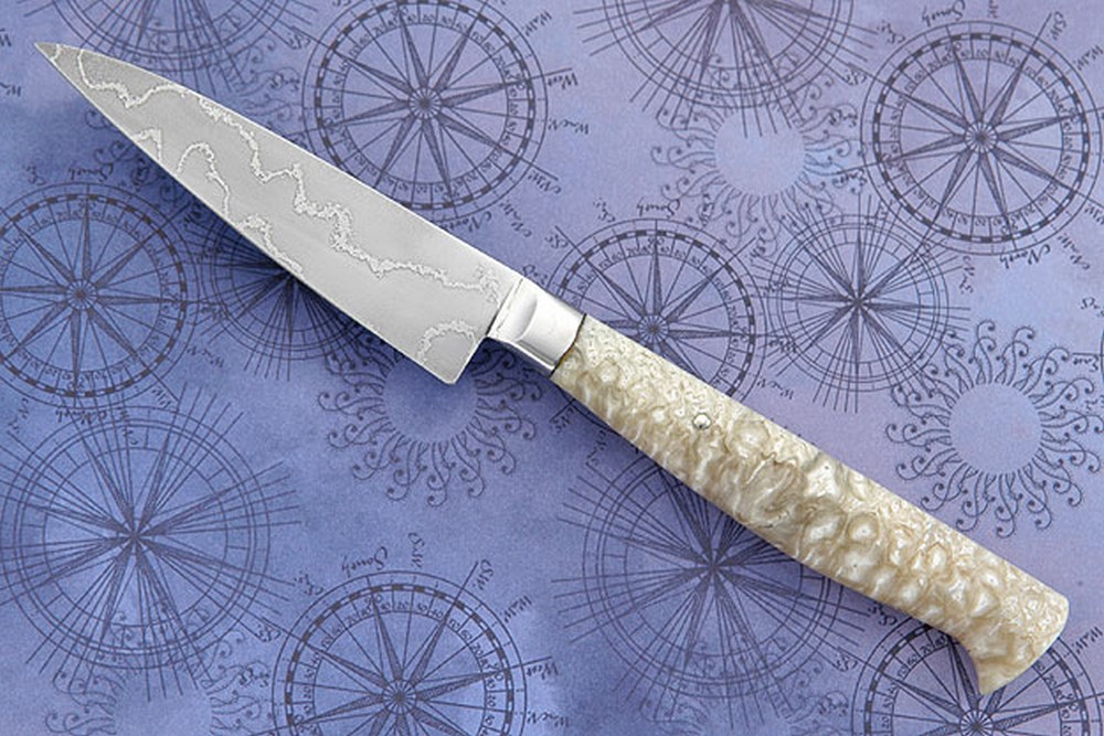 Like Bill's hunting knives, this 3-1/4 inch parer was pre-tested for edge flex and cutting ability before assembly. A particularly small grain structure (meaning the blade takes a truly exceptional edge) is created by a heat treatment process incorporating low temperature forging, a triple quench, and a triple temper.