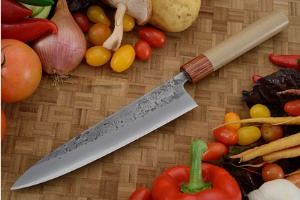 Description: The gyuto is modeled after the French pattern chef's knife. Longer and slimmer than the santoku, it is a perfect general purpose chef's knife. The long blade is needed for the sawing motion required to cut meats and the slim profile keeps the weight low and the balance right.