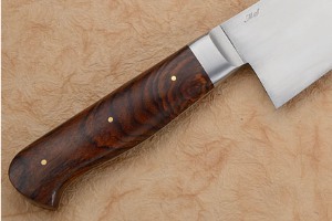 The handle is formed from presentation grade cocobolo. It is nicely carved to swell toward the front of the handle, move into a slimmer waist and finally to swell again at the beak at the end of the handle. This resinous wood is an excellent choice for use in either of home or commercial kitchen. The bolster is formed from 416 stainless steel, pinned and soldered to the blade for strength and durability. The knife has perfect balance and feels exceptional in the hand.