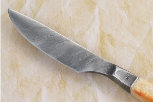 The drop point blade and the integral guard were forged from Gary's damascus beginning with 1080 and 15N20 carbon steels. The blade is a multi-bar composite in a twist pattern. The blade would make a great general utility blade, or, as Gary suggested, a wonderful personal steak knife.