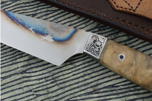 The blade is hand forged from 5160 carbon steel. A soft back draw results in a softer, supportive spine, with a keen, long lasting edge. The spine has been heat colored for a dramatic appearance. Both the tang and blade are distal tapered for optimal balance.