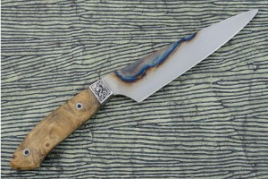 Description: Peter Pruyn created this exceptional slicer/utility. It will be an exceptional performer and is a perfect choice for use as a slicer/utility in the kitchen. Utility knives like this are perfect for slicing vegetables and meats. The 1-1/2 inch tall blade has just enough finger clearance over a cutting board that it could even be used for chopping by someone with a smaller hand.