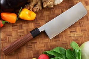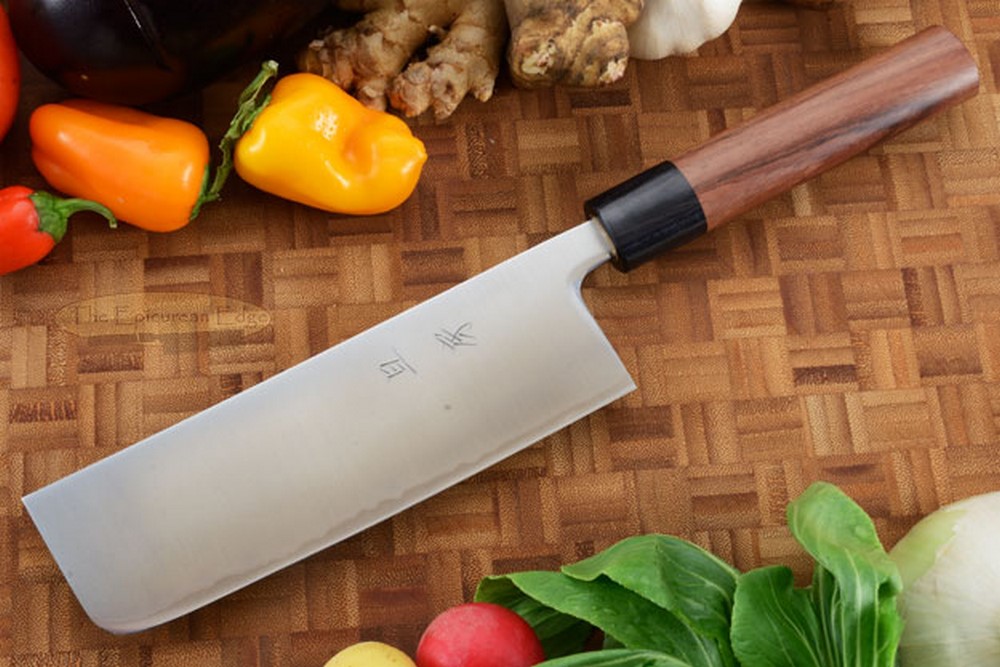 Description: The nakiri usuba is a traditional Japanese knife form ideal for chopping and slicing fruits and vegetables, as well as boneless meats. The edge is double beveled, like a Western knife. Though sometimes called a vegetable cleaver, the thin edge geometry makes it a precision tool, rather than a Japanese equivalent to meat cleavers.