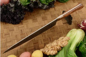 This high performance chef's knife is a perfect choice as a primary knife in the kitchen. The long, deep-bellied blade is well suited for slicing vegetables and meats. The gentle arch of the cutting edge is perfect for a rocking chopping motion with plenty of finger clearance over a cutting board.