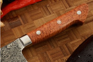 The handle was made by Daniel O'Malley using stabilized afzelia lay (Afzelia xylocarpa) wood. The red warm toned wood nicely complements the damascus. By using stabilized wood, Mr. O'Malley ensures that the handle will hold up extremely well to the demanding environment of a professional chef's kitchen. Stainless steel rivets surround a central mosaic pin. It is nicely carved to swell toward the front of the handle, move into a slimmer waist and finally to swell again at the beak at the end of the handle. The knife has perfect balance and feels exceptional in the hand.