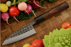 The hand hammered surface assists food to fall away rather than sticking to the side of the knife while chopping. The blade has a nice distal taper - beginning with a strong, thick spine where the blade moves out of the handle and diving into a thin, high performance blade as it moves toward the tip. This ensures optimal balance, control, and cutting.